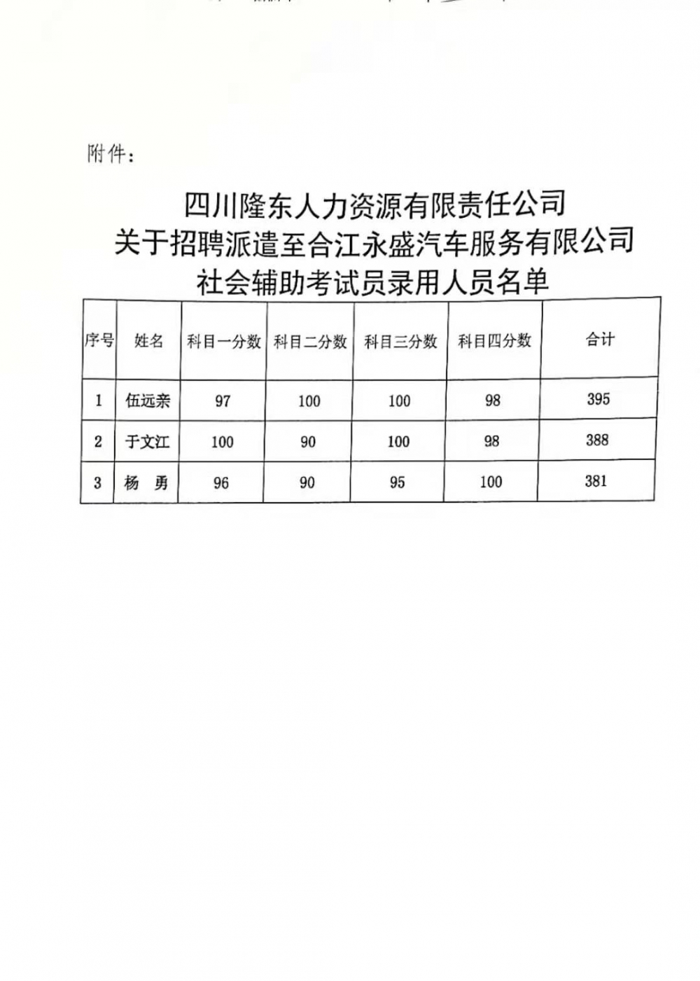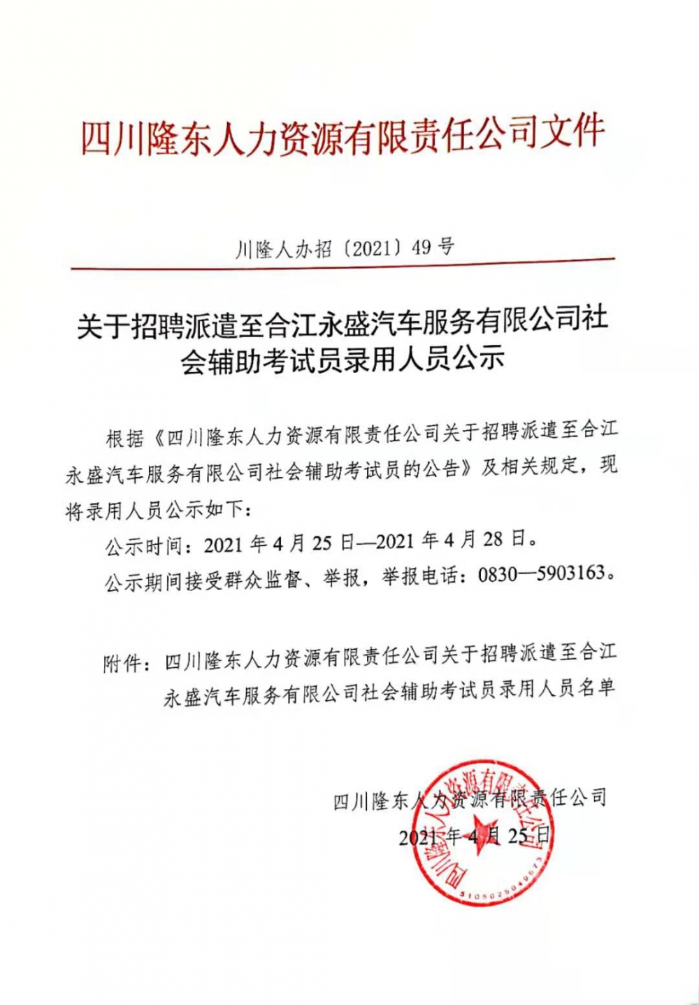 關(guān)于招聘派遣至合江永盛汽車服務(wù)有限公司社會輔助考試員錄用人員公示