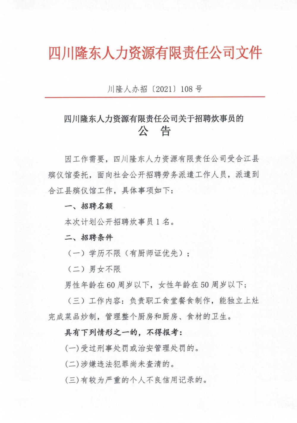 關(guān)于招聘派遣至合江縣殯儀館勞務(wù)人員的公 告